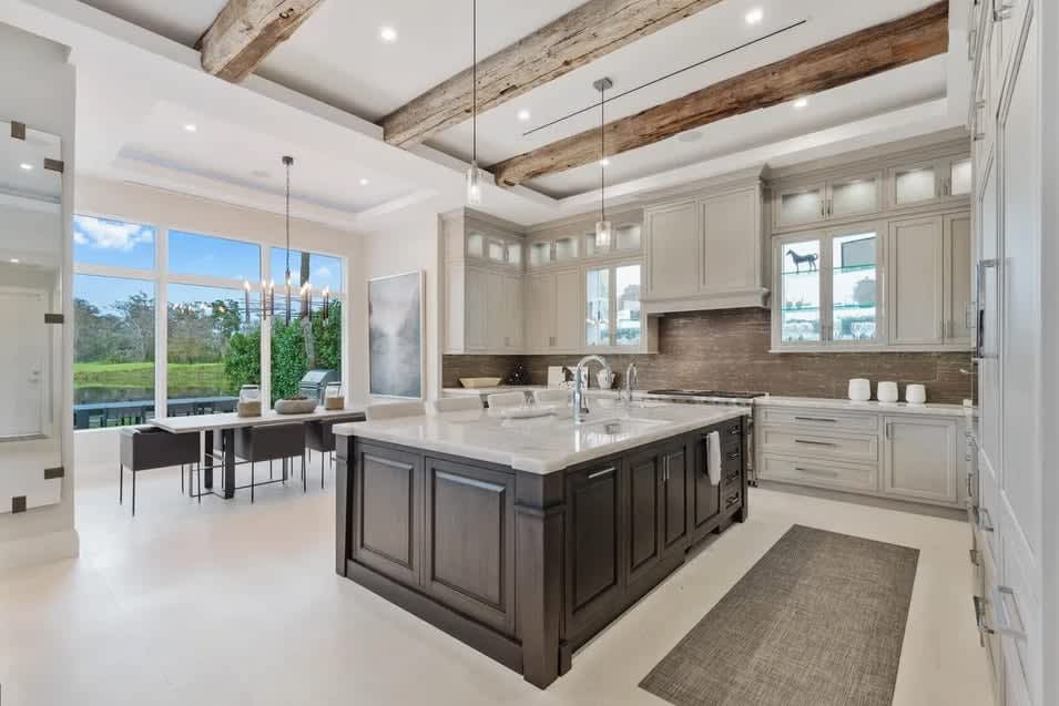 This enchanting four-bedroom bungalow and its freestanding casita were designed by acclaimed Galveston builder Christine Plum and are impressively detailed with repurposed vintage materials—including handmade Saltillo tile floors and antique European doors—used to uniquely stylish effect. The cook’s kitchen features a bespoke sculptural light fixture, a wall of built-ins surrounding a sideboard created from a reclaimed library card catalogue, leathered marble countertops, a colorful five-burner Kucht gas range with an artfully tiled hood, a Zellige tile backsplash, custom cabinetry, and open shelving.Luxurious Lakeside Living