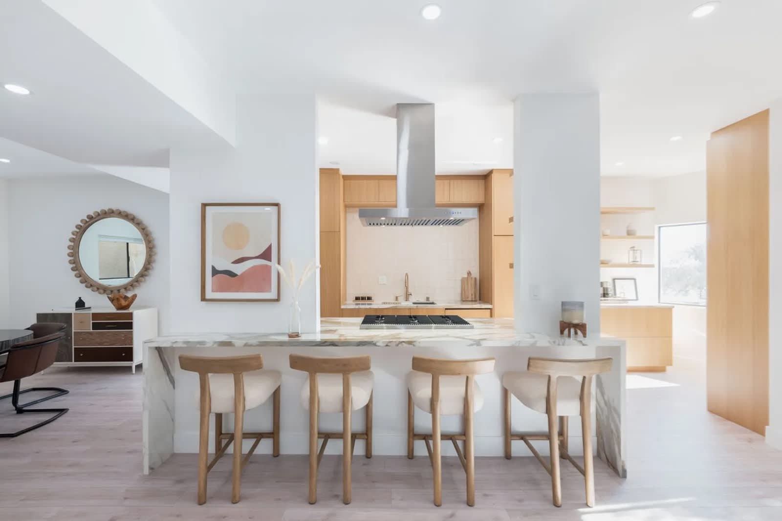 Minutes from famed Canyon Road and Santa Fe’s historic downtown Plaza, this chic contemporary home is anchored by an open living room, dining room, and kitchen ideal for effortless living and entertaining. In addition to a breezy portal with a sweeping view of city lights, sunsets, and mountains, it offers two restful bedrooms and an office or third bedroom with its own outdoor space. Soothing natural tones—including surfaces of elegant Neolith sintered stone and white art walls—contribute to the undeniable sense of modern sophistication.